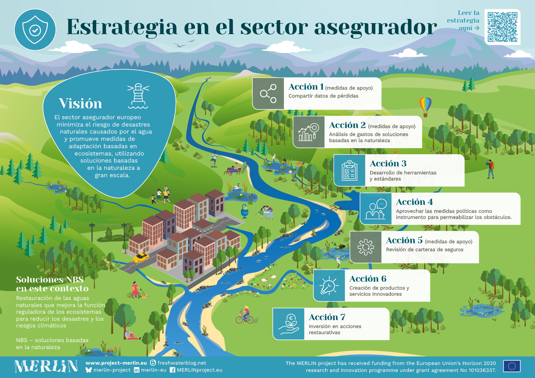 The MERLIN infographics contrasts a 'business as usual' scenario with a 'working with rivers' scenario, vividly illustrating the benefits of nature-based solutions and restoration for both people and nature. The infographics invite you to explore these changes interactively. Use the slider to reveal a dynamic 'before and after' view of the restoration scene. As you move the slider, you will see how the landscape, habitat quality, and biodiversity transform from baseline (pre-restoration) to revitalised (post-restoration) conditions – bringing the positive impact of restoration efforts to life.